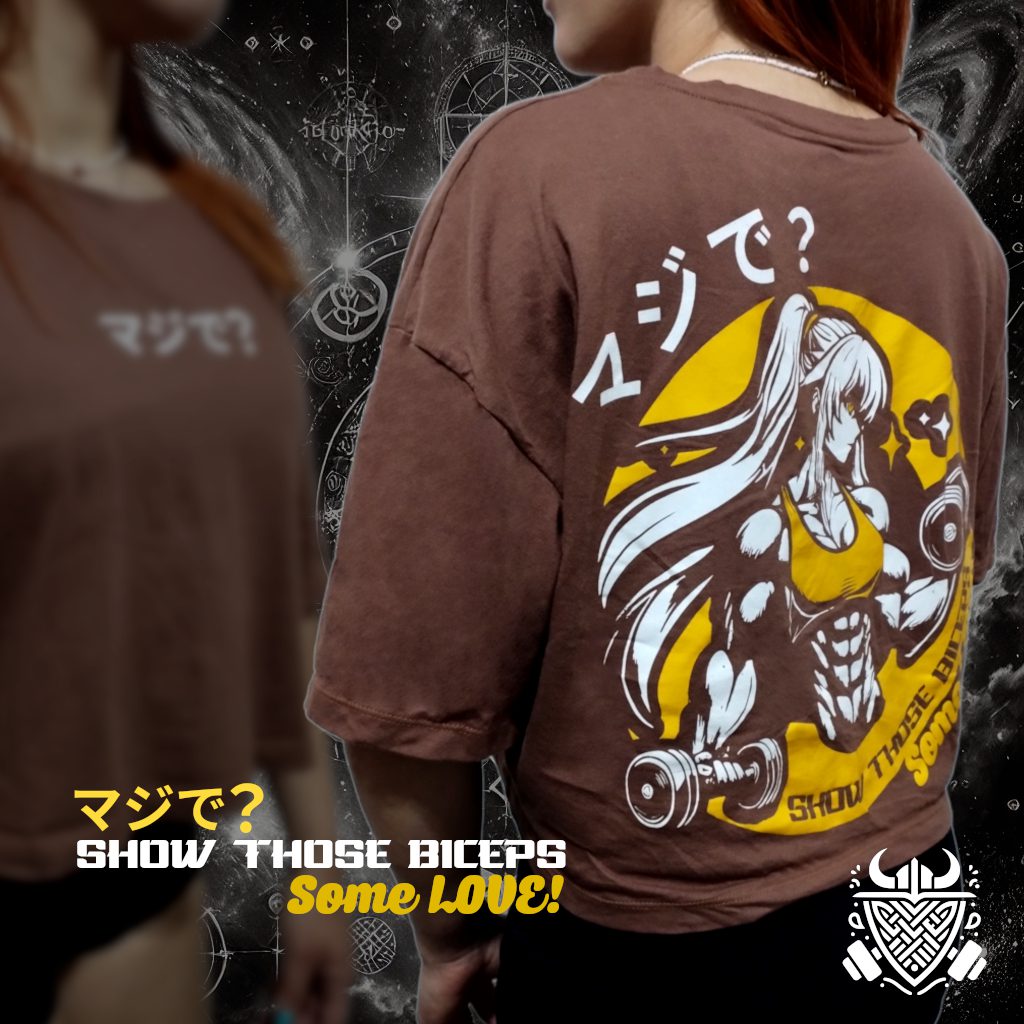 Croptop oversize «Show Those Biceps Some Love!» que celebra el empoderamiento femenino. Diseño en algodón premium con estampado de fuerza y motivación. Ideal para entrenamiento o looks casuales.